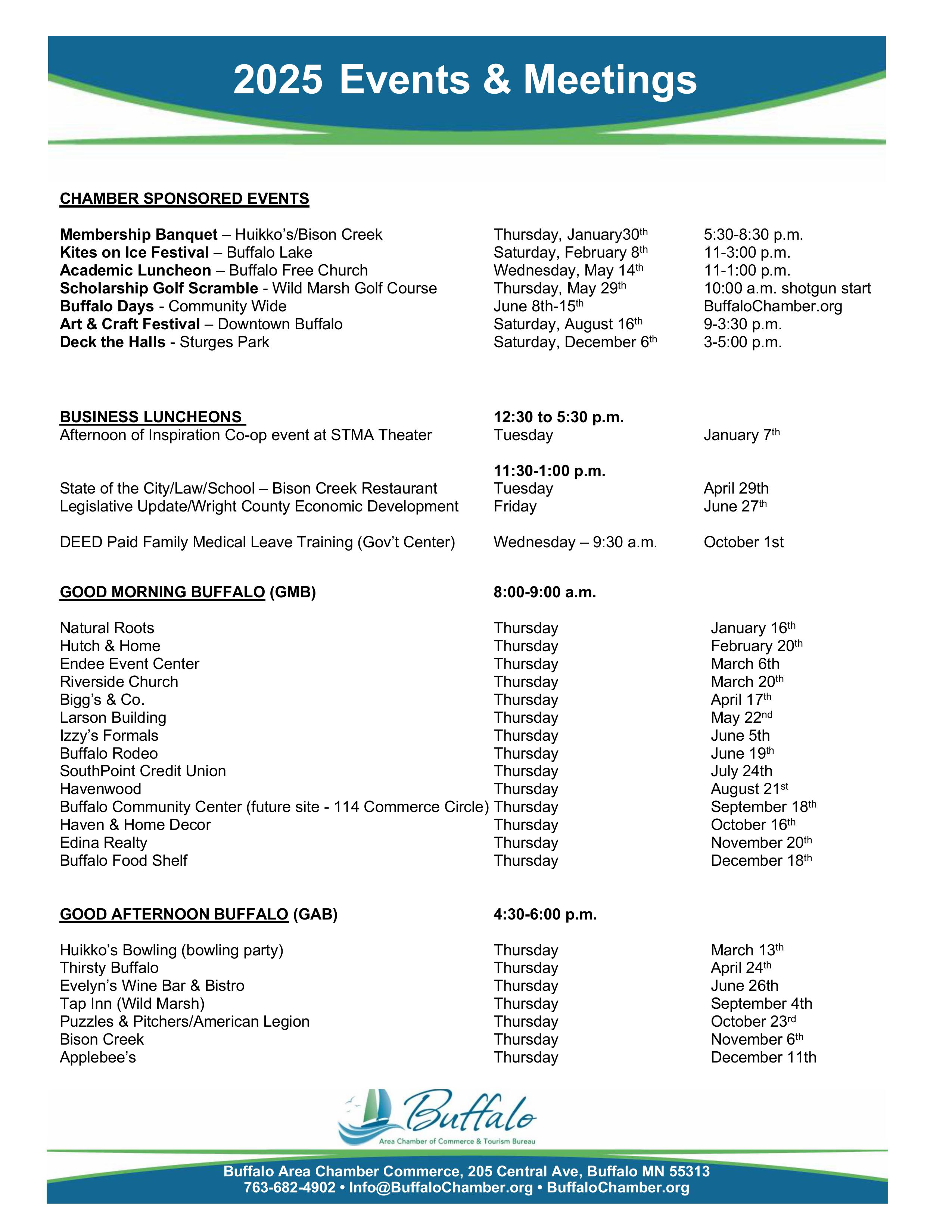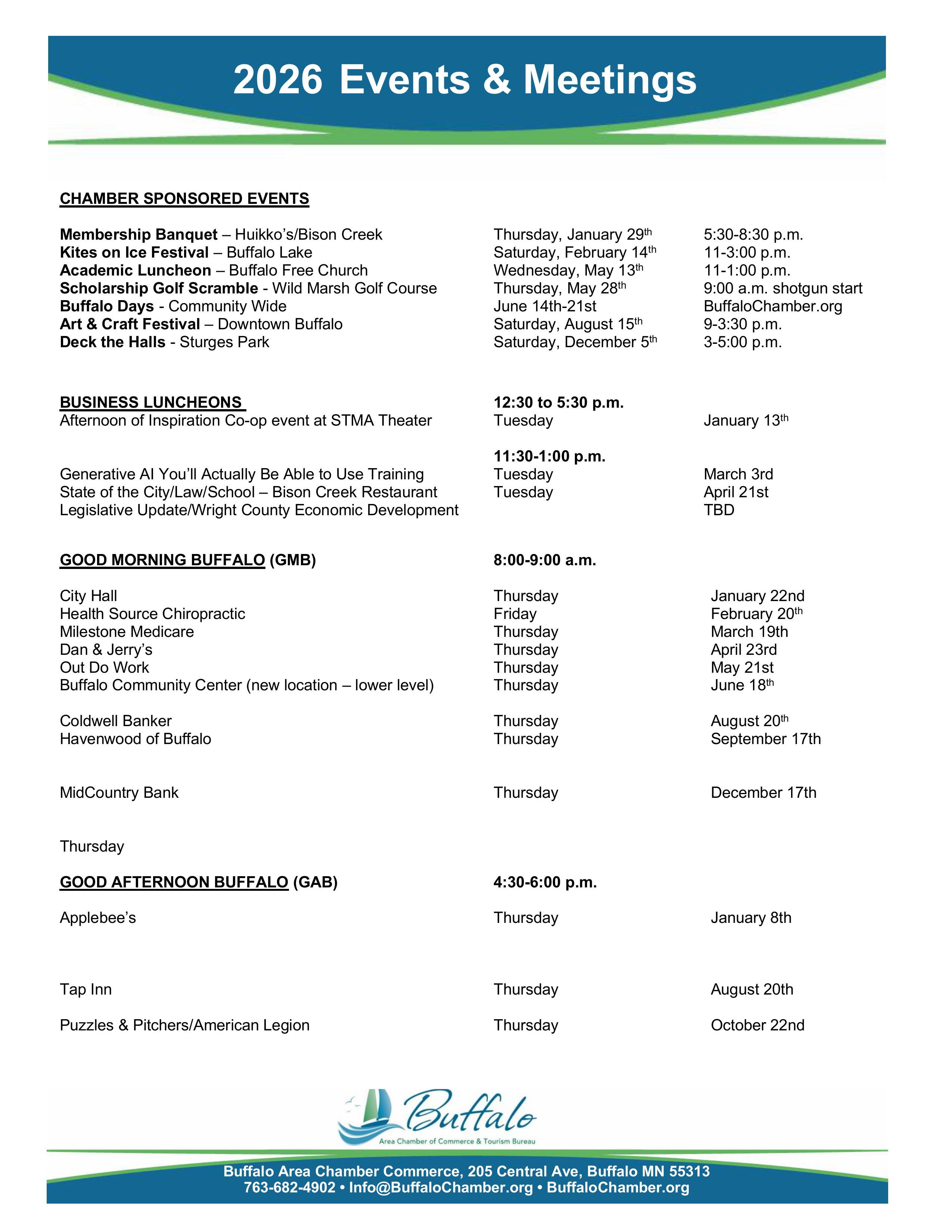 Hear from our local leaders what is happening in our community. From exciting changes to statistics and facts on our city and county.- Buffalo Chamber of Commerce, Sue Olmscheid